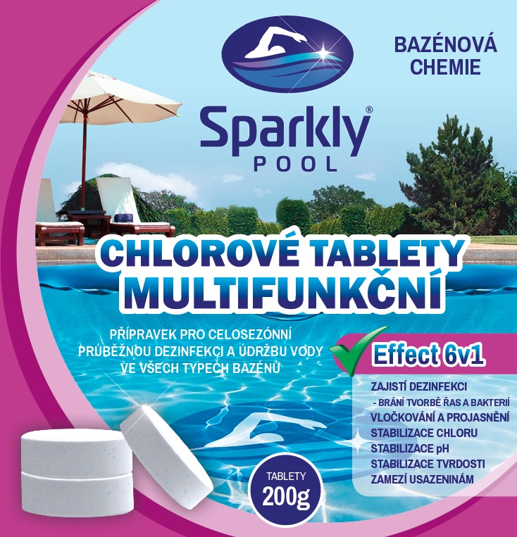Chlorové tablety do bazénu 6v1 multifunkční MAXI o hmotnosti 200 g je přípravek pro celosezónní průběžnou dezinfekci a údržbu vody ve všech typech bazénů. Tyto pomalurozpustné bazénové tablety 6v1 zajišťují dezinfekci, vločkují, projasňují, stabilizují chlor, pH, tvrdost a zamezují usazeninám. Bazénová chemie Sparkly POOL řeší každý problém s bazénovou vodou.
