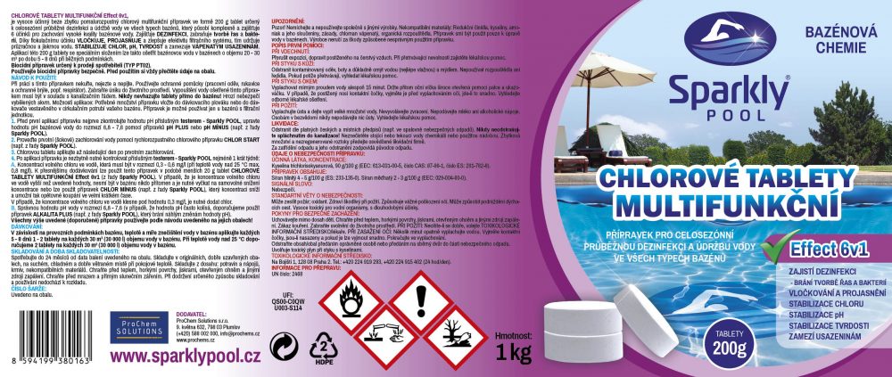 CHLOROVÉ TABLETY MULTIFUNKČNÍ Effect 6v1 MAXI 200 g, je vysoce účinný beze zbytku pomalurozpustný chlorový multifunkční přípravek ve formě 200g tablet určený k celosezónní průběžné dezinfekci a údržbě vody ve všech typech bazénů, který působí komplexně a zajišťuje 6 účinků pro zachování vysoké kvality bazénové vody. Zajišťuje DEZINFEKCI, zabraňuje tvorbě řas a bakterií. Díky flokulačnímu účinku VLOČKUJE, PROJASŇUJE a zlepšuje efektivitu filtračního systému, tím udržuje průzračnou a jiskrnou vodu. STABILIZUJE CHLOR, pH, TVRDOST a zamezuje VÁPENATÝM USAZENINÁM. Aplikací této 200g tablety se speciálním složením lze takto ošetřit bazénovou vodu v bazénech o objemu 20 - 30 m3 po dobu 5 - 8 dnů při běžných podmínkách. DÁVKOVÁNÍ: V závislosti na provozních podmínkách bazénu, teplotě a míře znečištění vody v bazénu aplikujte každých 5 - 8 dnů 1 - 2 tablety na každých 30 m3 (30 000 l) objemu vody v bazénu. Při teplotě vody nad 25 °C doporučujeme 2 tablety na každých 30 m3 (30 000 l) objemu vody v bazénu. Používejte biocidní přípravky bezpečně. Před použitím si vždy přečtěte údaje na obalu. PARAMETRY PRODUKTU Balení - hmotnost/obsah 5 kg Forma přípravku tablety 200 g Možnosti využití dezinfekce, řasy, bakterie UPOZORNĚNÍ: Pozor! Nemíchejte a nepoužívejte společně s jinými výrobky. Nekompatibilní materiály: Redukční činidla, kyseliny, amoniak a jeho sloučeniny, zásady, chlornan vápenatý, organická rozpouštědla. Přípravek smí být použit pouze k úpravě vody v bazénech. Výrobce neručí za škody způsobené nesprávným použitím přípravku. POPIS PRVNÍ POMOCI: PŘI VDECHNUTÍ: Přerušit expozici, dopravit postiženého na čerstvý vzduch. Při přetrvávající nevolnosti zajistěte lékařskou pomoc. PŘI STYKU S KŮŽÍ: Odstranit kontaminovaný oděv, boty a důkladně omýt vodou (nejlépe vlažnou) a mýdlem. Nepoužívat rozpouštědla ani ředidla. Pokud potíže přetrvávají, vyhledat lékařskou pomoc. PŘI STYKU S OKEM: Vyplachovat mírným proudem vody alespoň 15 minut. Držte přitom oční víčka široce otevřená pomocí palce a ukazováčku. V případě, že postižený nosí kontaktní čočky, vyjměte je před vyplachováním očí, jde-li to snadno. Vyhledejte odborné lékařské ošetření. PŘI POŽITÍ: Vyplachujte ústa a dejte vypít velké množství vody. Nevyvolávejte zvracení. Nepodávejte mléko ani alkoholické nápoje. Osobám v bezvědomí nikdy nepodávejte nic ústy. Vyhledejte lékařskou pomoc. LIKVIDACE: Odstranit dle platných českých a místních předpisů (např. ve spalovně nebezpečných odpadů). Nikdy neodstraňujte spláchnutím do kanalizace! Neznečistěte stojící nebo tekoucí vody chemikálií nebo použitou nádobou. Zbytková množství a nezregenerované roztoky předejte osvědčené likvidační firmě. Za zatřídění odpadu a jeho odstranění zodpovídá původce odpadu. ÚDAJE O NEBEZPEČNOSTI PŘÍPRAVKU: SIGNÁLNÍ SLOVO: Nebezpečí. STANDARTNÍ VĚTY O NEBEZPEČNOSTI: Může zesílit požár; oxidant. Zdraví škodlivý při požití. Způsobuje vážné poškození očí. Může způsobit podráždění dýchacích cest. Vysoce toxický pro vodní organismy, s dlouhodobými účinky. POKYNY PRO BEZPEČNÉ ZACHÁZENÍ: Uchovávejte mimo dosah dětí. Chraňte před teplem, horkými povrchy, jiskrami, otevřeným ohněm a jinými zdroji zapálení. Zákaz kouření. Zabraňte uvolnění do životního prostředí. PŘI POŽITÍ: Necítíte-li se dobře, volejte TOXIKOLOGICKÉ INFORMAČNÍ STŘEDISKO/lékaře. PŘI ZASAŽENÍ OČÍ: Několik minut opatrně vyplachujte vodou. Vyjměte kontaktní čočky, jsou-li nasazeny a pokud je lze vyjmout snadno. Pokračujte ve vyplachování. Odstraňte obsah/obal předáním oprávněné osobě nebo předáním na sběrný dvůr do části nebezpečného odpadu. Uvolňuje toxický plyn při styku s kyselinami. TOXIKOLOGICKÉ INFORMAČNÍ STŘEDISKO: Na Bojišti 1, 128 08 Praha 2. Tel.: +420 224 919 293, +420 224 915 402 (24 hod/den). varovné symboly