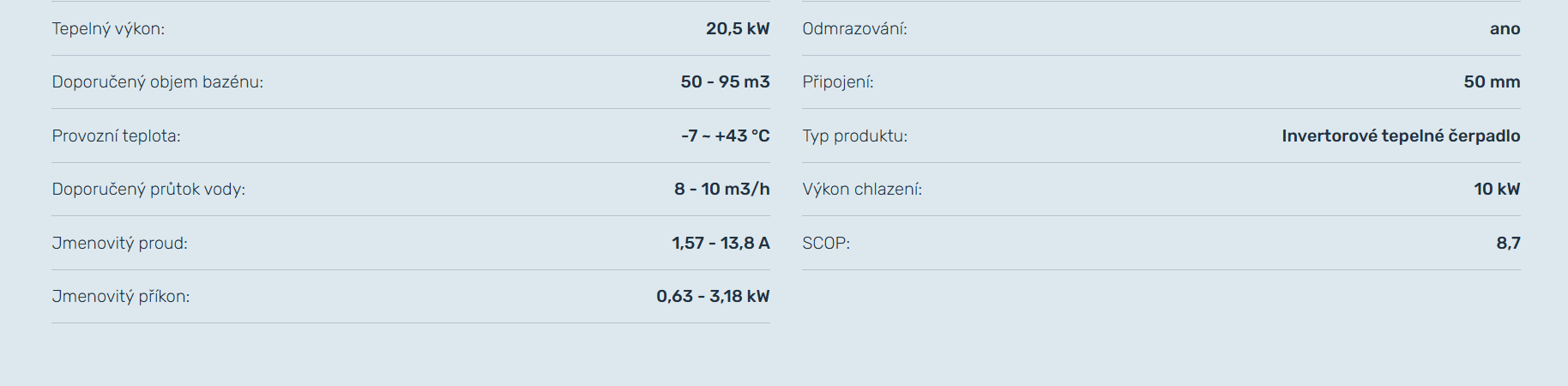 Invertorové tepelné čerpadlo, Chlazení: ano , Doporučený objem bazénu: 50 - 95 m3, Připojení: 50 mm, Použité chladivo: R32 , Napětí: 230 V, Účinnost: 15,3 C.O.P., SCOP: 8,7