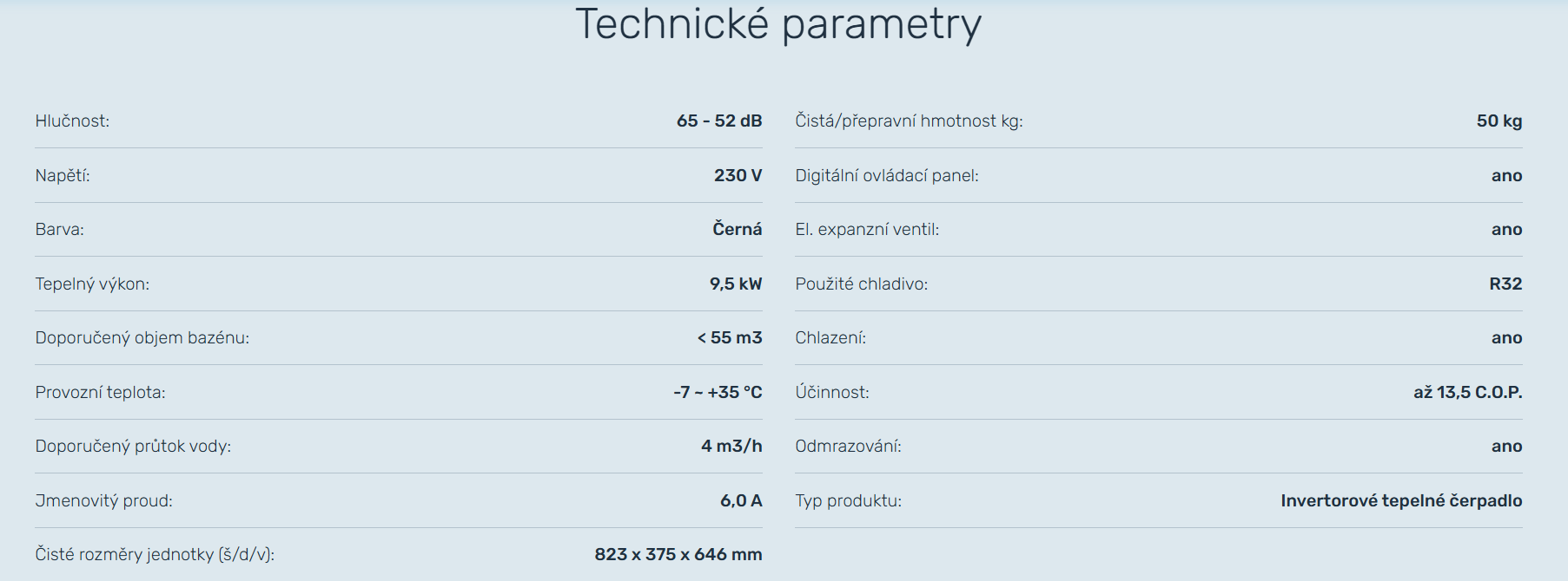 Invertorové tepelné čerpadlo, Chlazení: ano , Doporučený objem bazénu: < 55 m3, Použité chladivo: R32 , Napětí: 230 V, Účinnost: až 13,5 C.O.P.